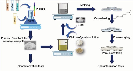 Pure and copper (Cu)-substituted nHA was synthesized using the chemical precipitation method under controlled pH and temperature. Pure and Cu-substituted nHA/Cs/Gel scaffolds were fabricated by salt-leaching/freeze-drying method. Physicochemical characteristics of nanoparticles and scaffolds were explored using XRD, FTIR, FE-SEM/EDX, and ICP. Besides, scaffold mechanical strength, degradation, porosity, swelling, biomineralization, and cytocompatibility were assessed.