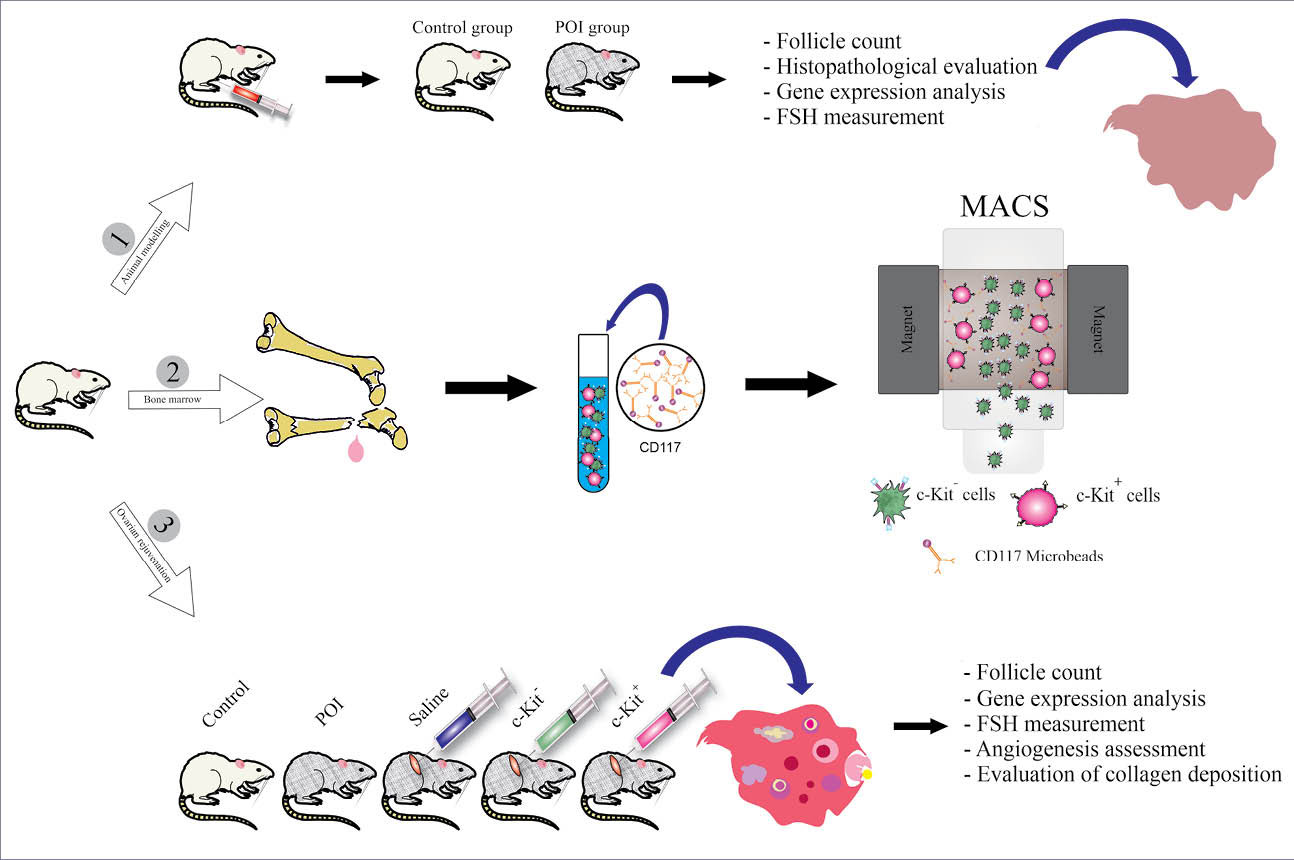 Therefore, we hypothesized that cells harboring the c-Kit receptor provide an appropriate candidate for the restoration of injured ovarian tissue. To our knowledge, the therapeutic effects of enriched populations of c-Kit+ cells on the rejuvenation of ovarian tissue have not yet been reported or described. Thus, in the present study, we aimed to investigate the recovery of ovarian function following transplantation of c-Kit+ cells using a rat model of POF. On this basis, we used conventional POF induction protocol induced by VCD (4-vinylcyclohexene dioxide) which is touted as a typical gonadotoxic chemical targeting primary follicles.