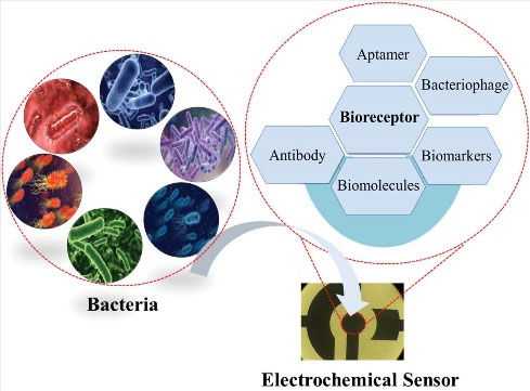 who reported the recent advancements and challenges in electrochemical detection of pathogenic bacteria. This review study focuses on designing bacteria-detecting sensors based on recognition elements that have not been reviewed so far. For this purpose, many references in the field were reviewed, and the review covered several issues, including (a) enzymes, (b) receptors, (c) antimicrobial peptides, (d) lectins, (e) redox-active metabolites, (f) aptamer, (g) bacteriophage, (h) antibody, and (i) molecularly imprinted polymers. Explanation is provided for detection method in each case in the following.