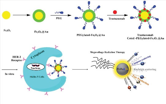 Along of their cytocompatibility and adaptable binding to biological molecules (antibodies), high atomic numbers nano-metals can be used in RT as sensitizers for therapeutic applications. A bimodal nano-agent was first prepared by synthesizing Fe3O4@AuNPs followed by labeling with TZ, for the therapeutics of HER-2 positive breast cancer cells.