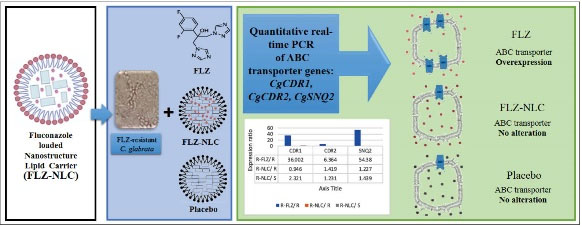 The ultrasound technique was used to synthesize the FLZ-NLCs. Four fluconazole-resistant, as well as one susceptible standard C. glabrata isolates, were applied and exposed to FLZ/ FLZ-NLCs for 20 h at 37°C. Real-time PCRs were done to estimate the likely changes in ATP-binding cassette transporter genes.
