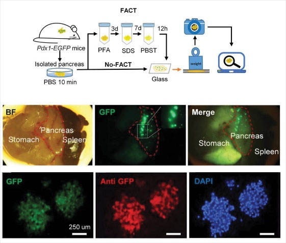 Compiled fluorescent images of pancreas resulted in enhanced beta cell mass characterization in FACT-cleared sections (2928869±120215 AU) compared to No-FACT cleared sections (1292372±325632 AU). Additionally, the total number of detected islets with this method was significantly higher than the other clearance methods (155.7 and 109, respectively). Using this method, we showed green fluorescent protein (GFP) expression confined to beta cells in Tg(Pdx1-GFP) transgenic. This enhanced GFP expression enabled us to accurately measure beta cell loss in a beta cell destruction model. The results suggest that our proposed method can be used as a simple, and rapid assay for beta cell mass measurement in islet biology and diabetes studies.
