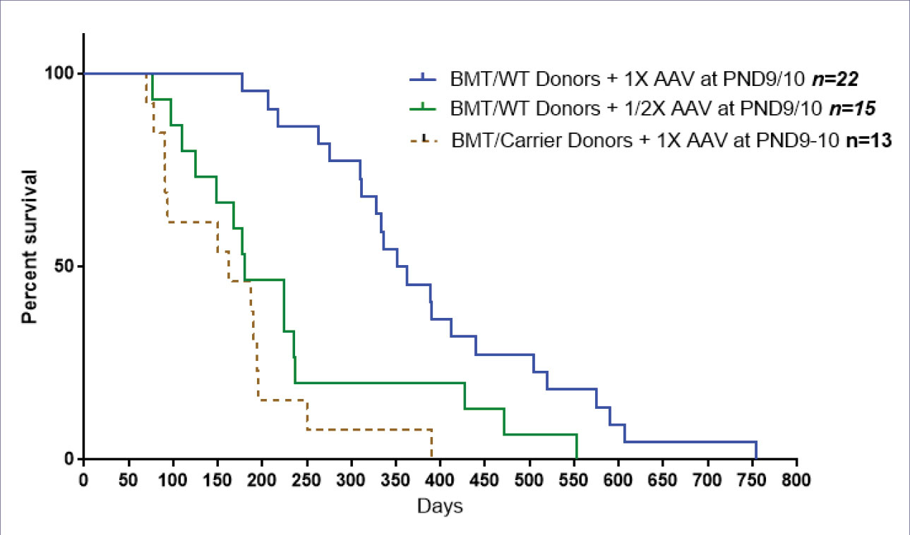 This is an additional reason for eliminating BMT in combination with gene therapy, as we are hitting two targets when using high dose gene therapy alone: delivering enzyme to the nervous system directly and via the transduced BM cells indirectly.