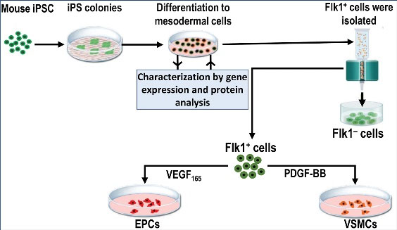 Induced PS cells were differentiated into lateral mesoderm cells (Flk1+). The Flk1+ populations were isolated on day 5.5 of the mesodermal differentiation period. Flk1+ cells were further differentiated into EPCs and VSMCs using VEGF165 and platelet-derived growth factor-BB (PDGF-BB), respectively, and then characterized using gene expression levels, immunocytochemistry (ICC), and western blot (WB) methods. During the differentiation steps, the expression levels of the marker genes and proto-oncogenic Myc and Klf4 genes were simultaneously studied.