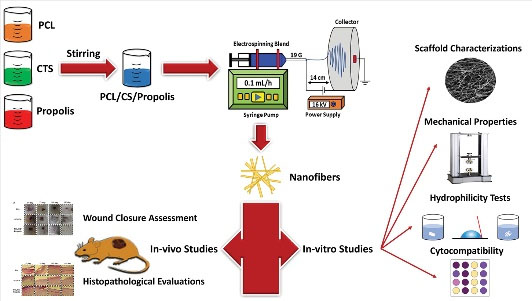 In this study, a nanofibrous mat composed of PCL, CTS, and propolis was fabricated for promoting wound healing. The produced mat was expected to not only have suitable physiochemical properties and good biocompatibility, but also accelerate the healing process.
