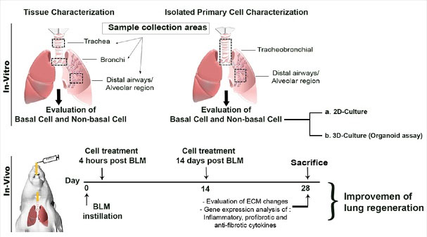 Human fetal lower respiratory tissues from pseudoglandular and canalicular stages and their isolated epithelial cells were evaluated by immunostaining, electron microscopy, flow cytometry, organoid assay, and gene expression studies. The regenerative potential of the isolated cells has been evaluated in a rat model of bleomycin-induced pulmonary injury by tracheal instillation on days 0 and 14 after injury and harvest of the lungs on day 28.