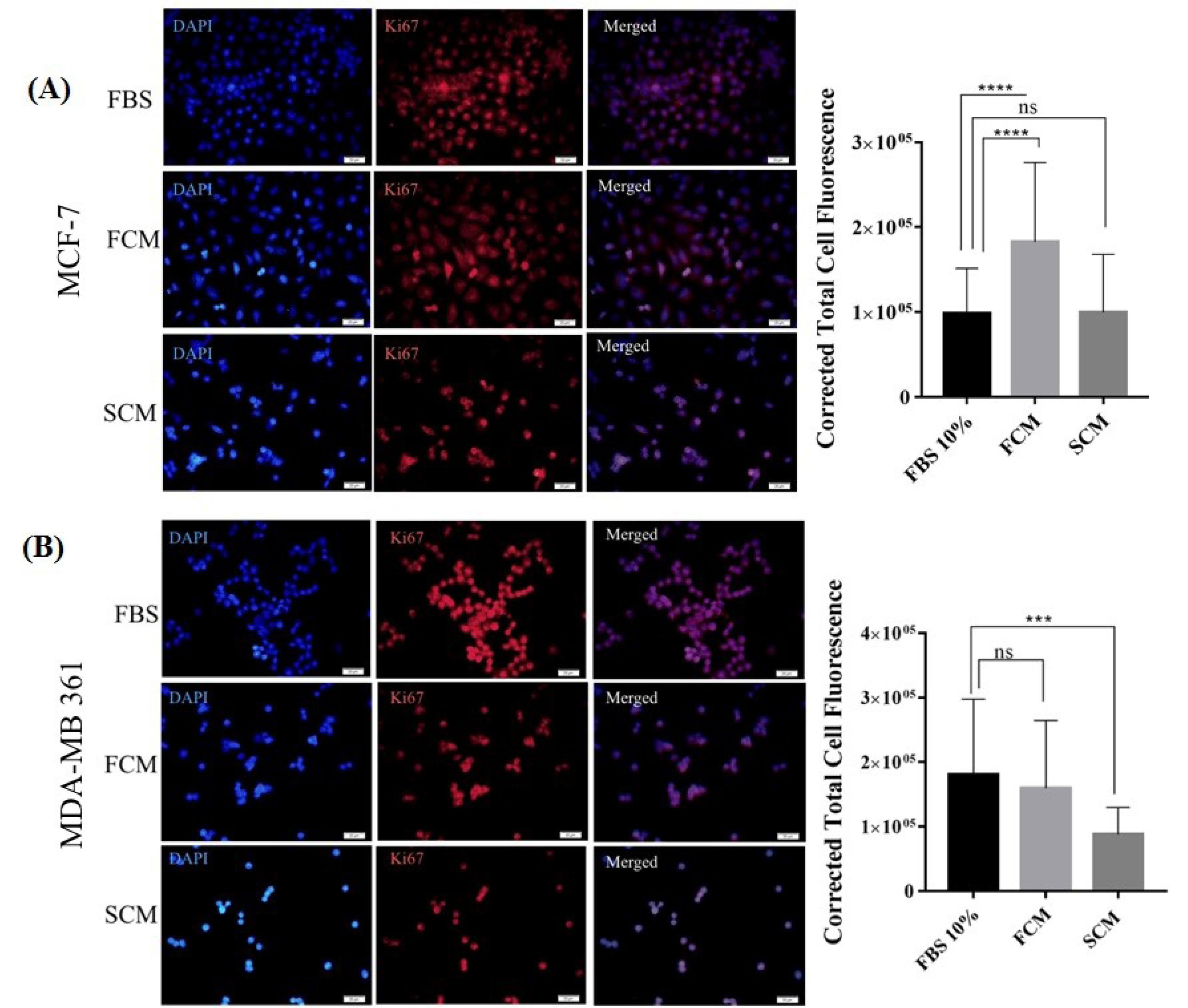 Immunofluorescence microscope images of Ki67 expression in MCF-7 and MDA-MB 361 cells with 400X magnification. (A) The first row indicates MCF-7 cells treated with FBS 10% (control group), the second row indicates cells treated with normal fibroblast conditioned medium (FCM), and the third row indicates cells treated with spheroidal conditioned medium (SCM) for 48 hours. Nuclei are stained with blue DAPI dye. Quantification was performed by ImageJ software through calculating corrected total cell fluorescence (CTCF) and data is presented in a histogram. (B) The first row indicates MDA- MB 361 cells treated with FBS 10% (control group), the second row indicates cells treated with normal fibroblasts conditioned medium (FCM), and the third row indicates cells treated with spheroidal conditioned medium (SCM) for 48 hours. The nuclei were stained with blue DAPI dye. Quantification was performed by image J software through calculating corrected total cell fluorescence (CTCF) and data is presented in a histogram. Scale = 20 μM, ***P≤0.001, non-significant; ns.