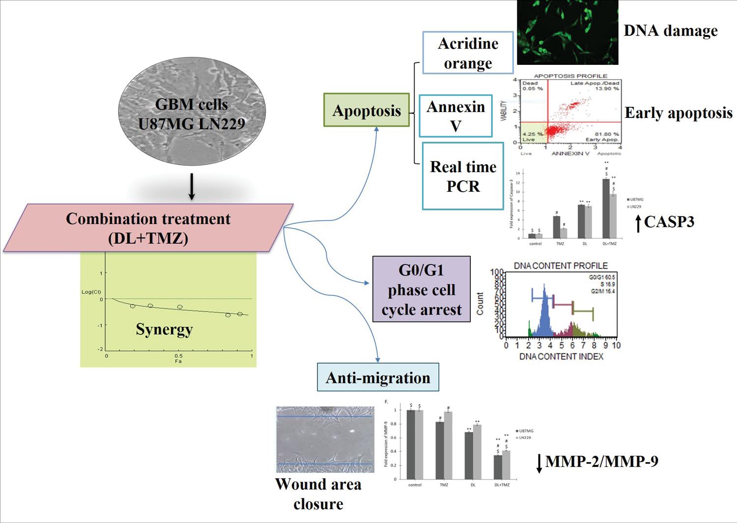 The purpose of the current research study was to evaluate the effectiveness of the combination of TMZ and DL treatment by assessing their influence on cell progression, cell migration, and apoptosis in U87MG and LN229 GBM cells.