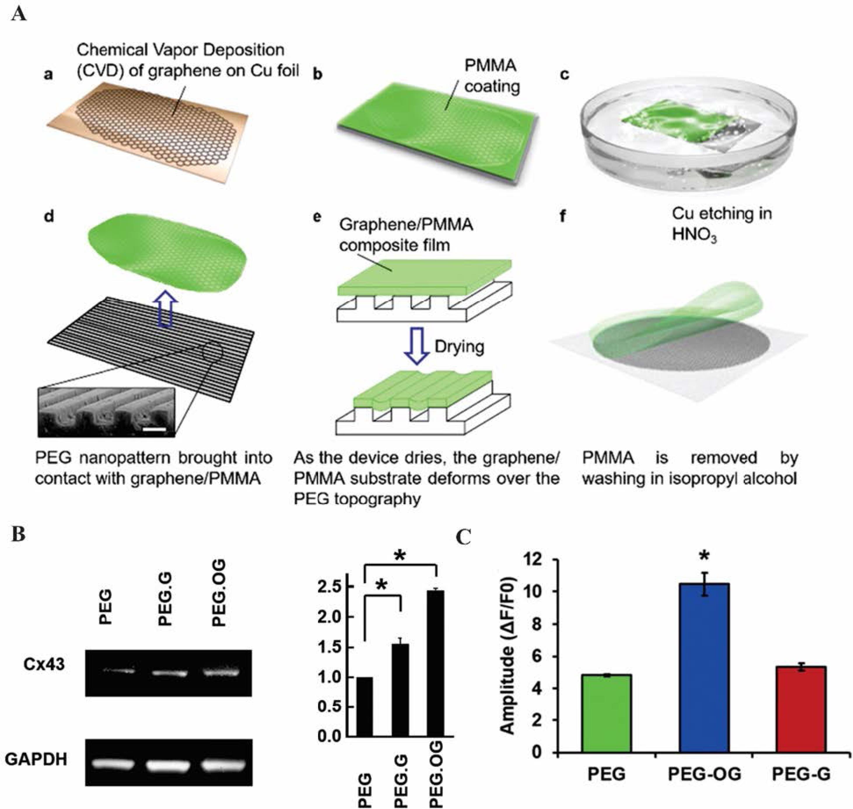 The micro-and nano-patterned conductive GR–PEG hybrid scaffold for cardiac tissue engineering. (A) Illustration of patterned conductive GR–PEG hybrid scaffolds process. (a) A GR layer formation by chemical vapor deposition (CVD) on copper foil, (b) PMMA coated on GR layer, (c) The copper foil was etched in an HNO3 bath, (d) GR/PMMA composite was placed in water and PEG patterns were raised to contact with the topography, (e) The GR/PMMA was dried on PEG substrate. GR/ PMMA in the groove region was prepared by the GR/PMMA layer wets the micro-and nano-patterned PEG, (f) G-PEG was washed with isopropyl alcohol and rinsed in de-ionized water. (B) Characterization of gap junction protein expression by Western blot analysis and Quantification of Cx43 expression in PEG, PEG.G, and PEG.OG. (C) Analysis of calcium transient waveforms and Ca2+ transient amplitude of PEG, PEG.G, PEG.OG in the grown cardiac cells.64 Copyright 2017. Reproduced with permission from the Royal Society of Chemistry. GR, graphene; PMMA, poly(methyl methacrylate); PEG, polyethylene glycol.