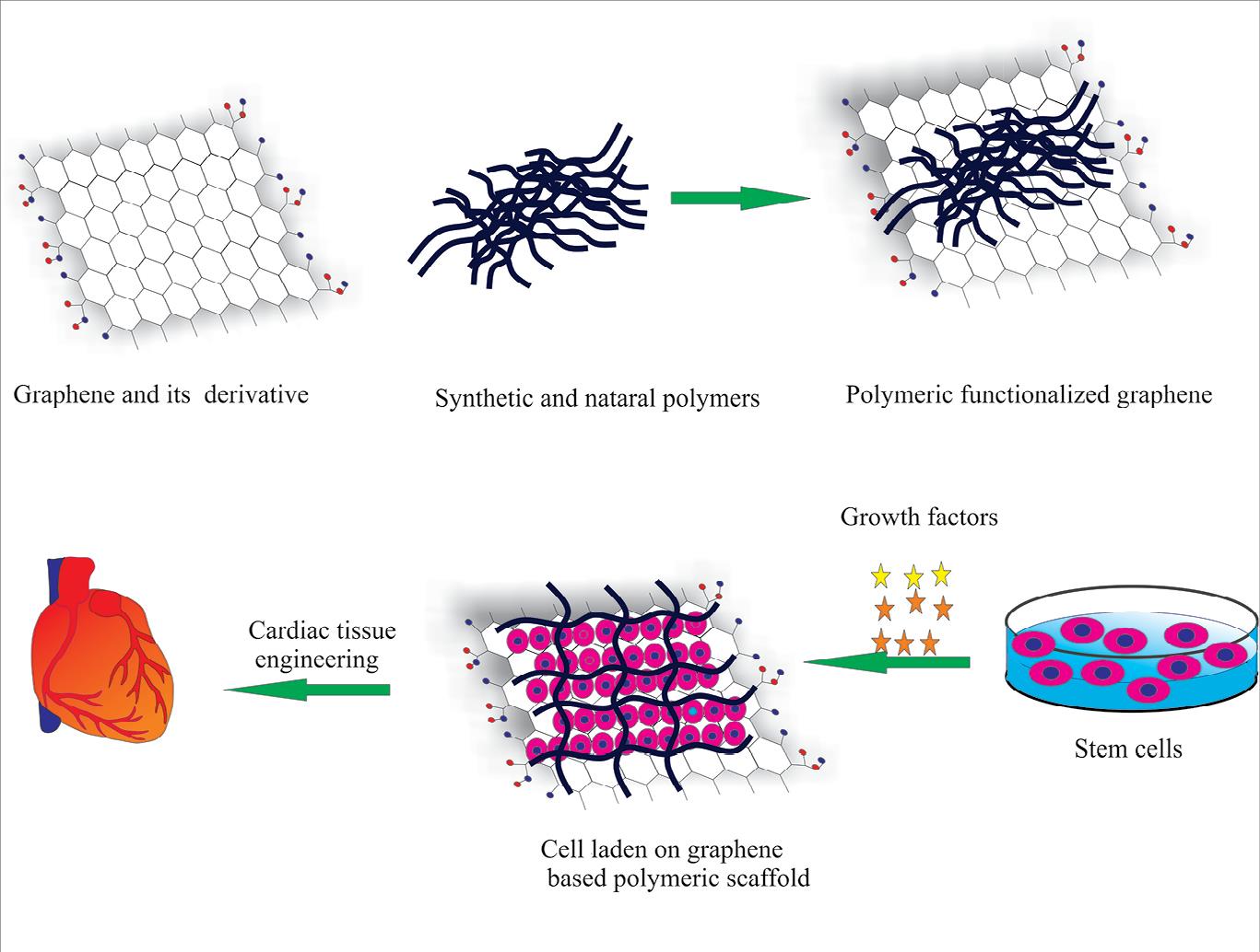 Cardiac tissue regeneration characteristically utilizes an extracellular matrix (scaffold), cells, and growth factors that enhance cell adhesion, growth, and cardiogenic differentiation. From the various evaluated electroactive polymeric scaffolds for cardiac tissue regeneration in the past decade, graphene and its derivatives-based materials can be utilized efficiently for cardiac tissue engineering.