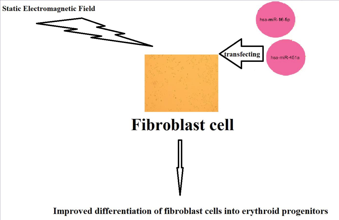In general, it can be concluded that the treatments of fibroblast cells with 10mT ELF-EMF for 20 minutes every day for 7 days, along with the upregulations of miR-16 and miR-451 are effective approaches in increasing the differentiation of these cells into erythroid like progenitors. However, to achieve large-scale ex vivo blood production using this approach, more studies are needed.