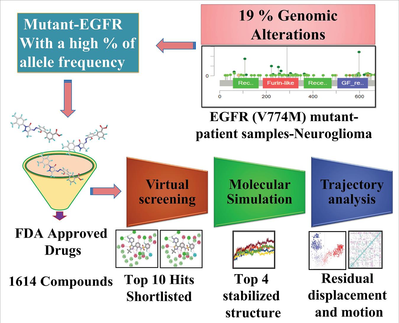 Tyrosine kinase inhibitors (TKIs), antibodies, and vaccinations are utilized to block the EGFR signaling network, making it a popular target for medicinal therapies.16 Recent studies suggest that in Erlotinib-treated patients, co-expression of PTEN and EGFRvIII are not associated with increased survival.16 Erlotinib is an EGFR inhibitor with a low response rate and patient survival rate.16 So, there is an urgent need to identify the new mutation of EGFR having high-frequency rates in neuroglioma and target them with specific and effective drugs. In the drug development process, in silico computational approaches, in recent times with significant technological advancements, have become invincible tools for discovering and repurposing purposes with the shortest times and greater probability of achieving the new or repurposed drugs.17 Molecular docking and molecular dynamics simulation are advanced computational techniques that enable high-throughput virtual screening (HTVS) of large molecular libraries.18 These approaches assess the binding affinity between ligands and target receptors and generate scores to evaluate the results. In addition, they provide valuable structural insights into how ligands interact with target receptors, offering a view on the blocking mechanism. This information is crucial for identifying and confirming effective ligands with potential therapeutic applications. Overall, these methods surpass conventional techniques in their ability to generate structural hypotheses and aid in identifying promising ligands. The primary aim of this study was to identify a specific mutation in EGFR frequently observed in patients with neuroglioma. Further, the mutated form and wild-type EGFR was investigated as potential targets for assessing molecular drug interaction changes. A repurposing approach was also employed to screen FDA-approved drugs in order to identify potential therapeutic agents for further evaluation.