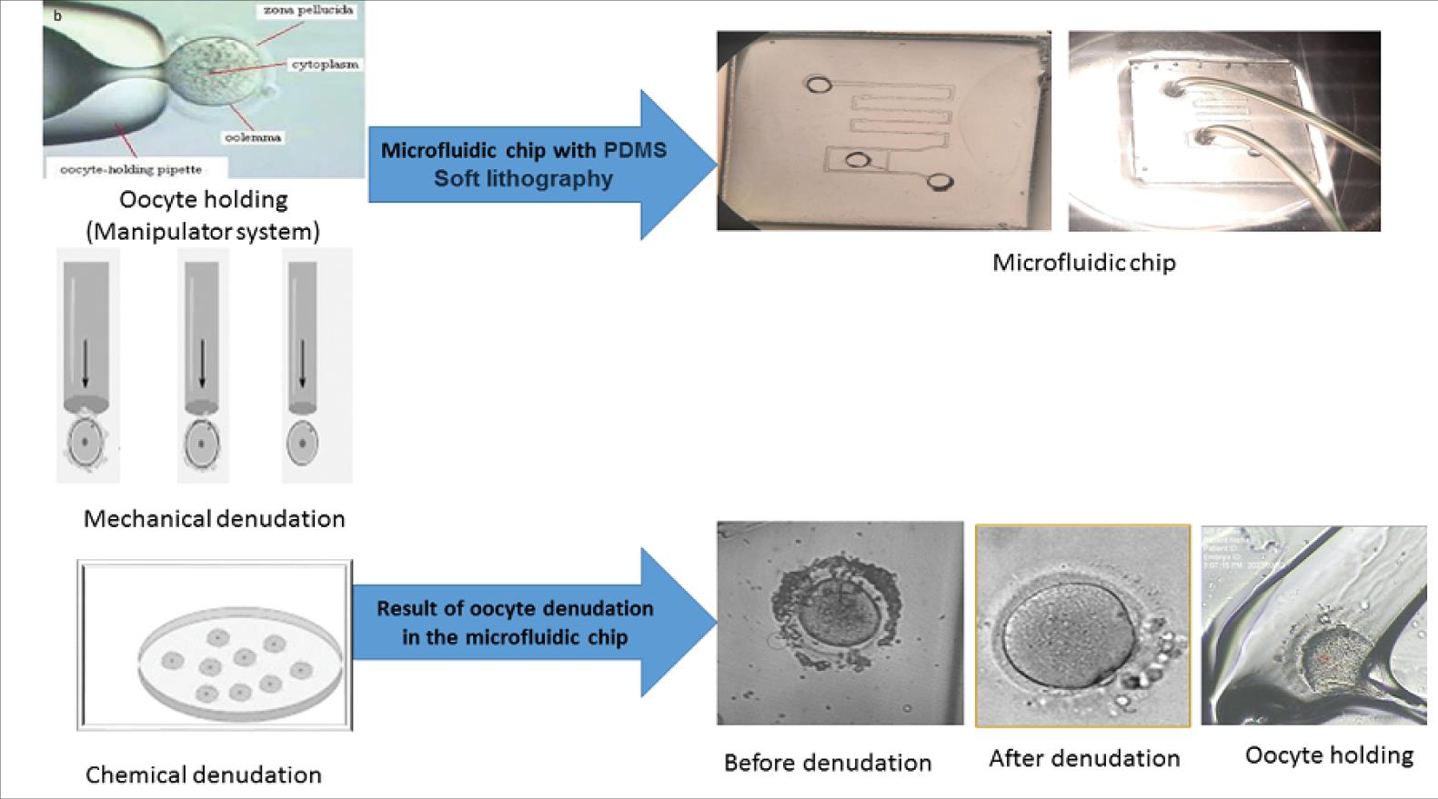 The fabrication process of the microfluidic chip involves standard injection molding over a PDMS substrate, resulting in a substantial cost reduction compared to traditional techniques. This microfluidic chip presents a viable and reliable substitute for current procedures in embryology laboratories. It holds promise for enhancing the efficiency of oocyte denudation, trapping, and immobilization procedures, thereby advancing the field of assisted reproductive techniques. By streamlining these crucial steps, the chip contributes to the optimization and cost-effectiveness of ART procedures in infertility treatments. With further optimization and refinement, this microfluidic chip has the potential to revolutionize current practices in the field of embryology and bring forth significant benefits to patients seeking fertility treatments. Investigation of the acceptable amount of suction to immobilize the oocyte and the fertilization quality of the oocytes used in this LOC, besides the expansion of the chip function, is one of the future works of our group.