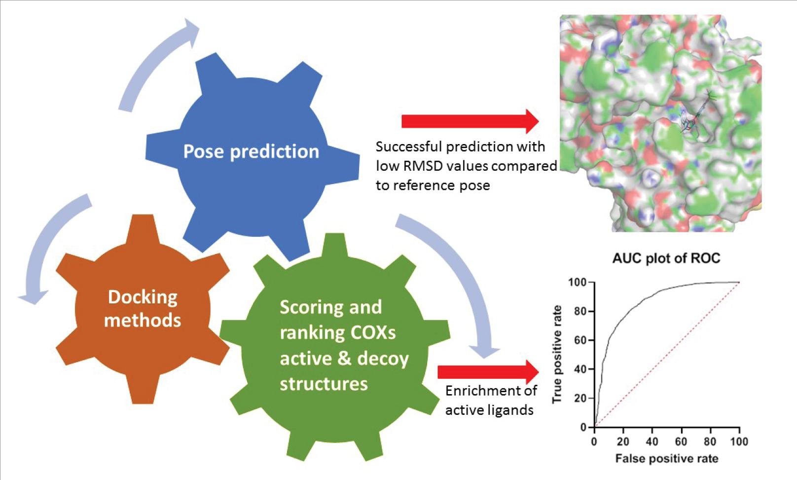 The receiver operating characteristics (ROC) curve with the calculation of the area under the curve (AUC) is a practical way of measuring the overall performance of diagnostic tests. In the case of testing docking algorithms, ROC curves can allow a direct comparison of different virtual screening workflows. In virtual drug screening, ROC curves are often used to visualize the efficiency of the used application to separate active ligands from inactive molecules. In general, the higher the AUC, the more effective the virtual screening workflow is in discriminating active compounds from inactive compounds. In this context, sensitivity (Se) is the percentage of truly active compounds being selected. On the other hand, specificity (Sp) is the percentage of truly inactive compounds that are discarded.36,37 Due to the importance of molecular docking in drug design and discovery, the current study aimed to evaluate a set of popular docking programs, namely GOLD, AutoDock, LeadIT (FlexX), Molegro Virtual Docker (MVD) and Glide, for their performance to correctly predict the poses of bound ligands to COX-1 and COX-2 enzymes determined experimentally. In addition to this, AutoDock, GOLD, Glide and FlexX were evaluated by comparing their effectiveness in selecting active compounds from a database of decoys in virtual screening.