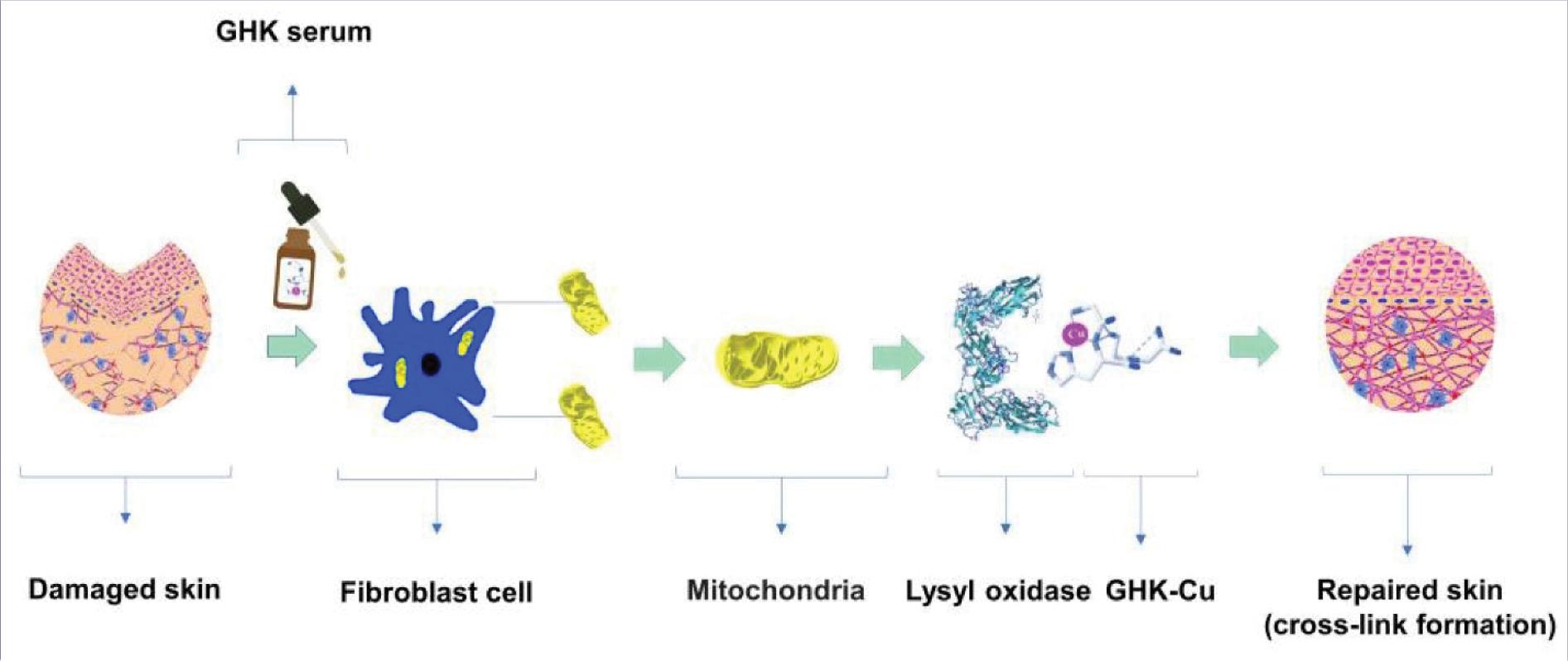As mentioned earlier, GHK can carry and transfer copper, a crucial element for the performance of the enzyme lysyl oxidase that is produced in the mitochondria of fibroblast cells. This essential enzyme for the stabilization of extracellular matrixes mediates cross-linking in connective tissue via catalyzing the oxidative deamination of amine group in lysyl residues in tropocollagen and tropoelastin. Lack of copper can lead to the lysyl oxidase insufficiency and subsequently mechanical changes in the skin.7,9