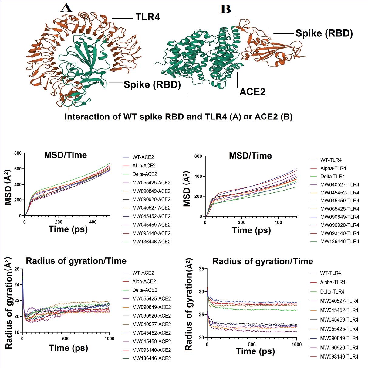 Four 9-mer antigen epitopes have been identified for the SARS-CoV-2 spike protein that bind to the TLR4/MD-2 complex. Two of them bind directly to the TLR4 protein and are located in the RBD.56 Based on this information, the spike RBD region was considered for both ACE2 and TLR4 docking and MD simulation. According to the docking result and MD simulation, the Alpha-TLR4 complex was formed with higher compactness due to higher binding affinity, although it had lower stability (higher MSD) than WT-TLR4. The poor MSD value for the Alpha-TLR4 complex despite good affinity and Rg value suggests that the mutations in the Alpha variant may have a complex influence on the stability and dynamics of the interaction with TLR4. The increased MSD value indicates a stronger fluctuation and lower stability of the complex over time. This could be due to the specific structural changes induced by the mutations in the Alpha variant, leading to a more dynamic interaction despite the stronger binding and compactness. The Delta-TLR4 complex was formed with a higher affinity and stability and only a slight lower compactness than WT-TLR4. Delta mutations would allow a closer association with TLR4 in longer simulations. It appears that the Delta mutant is a variant of concern not only due to its tighter interaction with hACE2, but also with TLR4. Most Iranian sequences (except MW136446 and MW090920) were docked with higher affinity to TLR4 and had lower Rg values than WT, indicating higher compactness. However, most of them had lower stability than WT (except MW136446), as shown by the MSD values. A significant decrease in Rg values was observed for complexes of MW090920-, MW045452-, MW040527-, MW090849- and MW045459-TLR4 compared to WT. Considering their high TLR4 binding affinity compared to WT, these variants may be important for higher transmission rate and rapid spread. A vaccine construct against SARS-CoV-2 has been designed and evaluated by molecular docking and MD simulation. A high binding affinity to the extracellular domains of TLR4 was observed.57 It would be advantageous to include different RBD mutations of SARS-CoV-2 in the design of vaccine constructs to prevent immune escape.