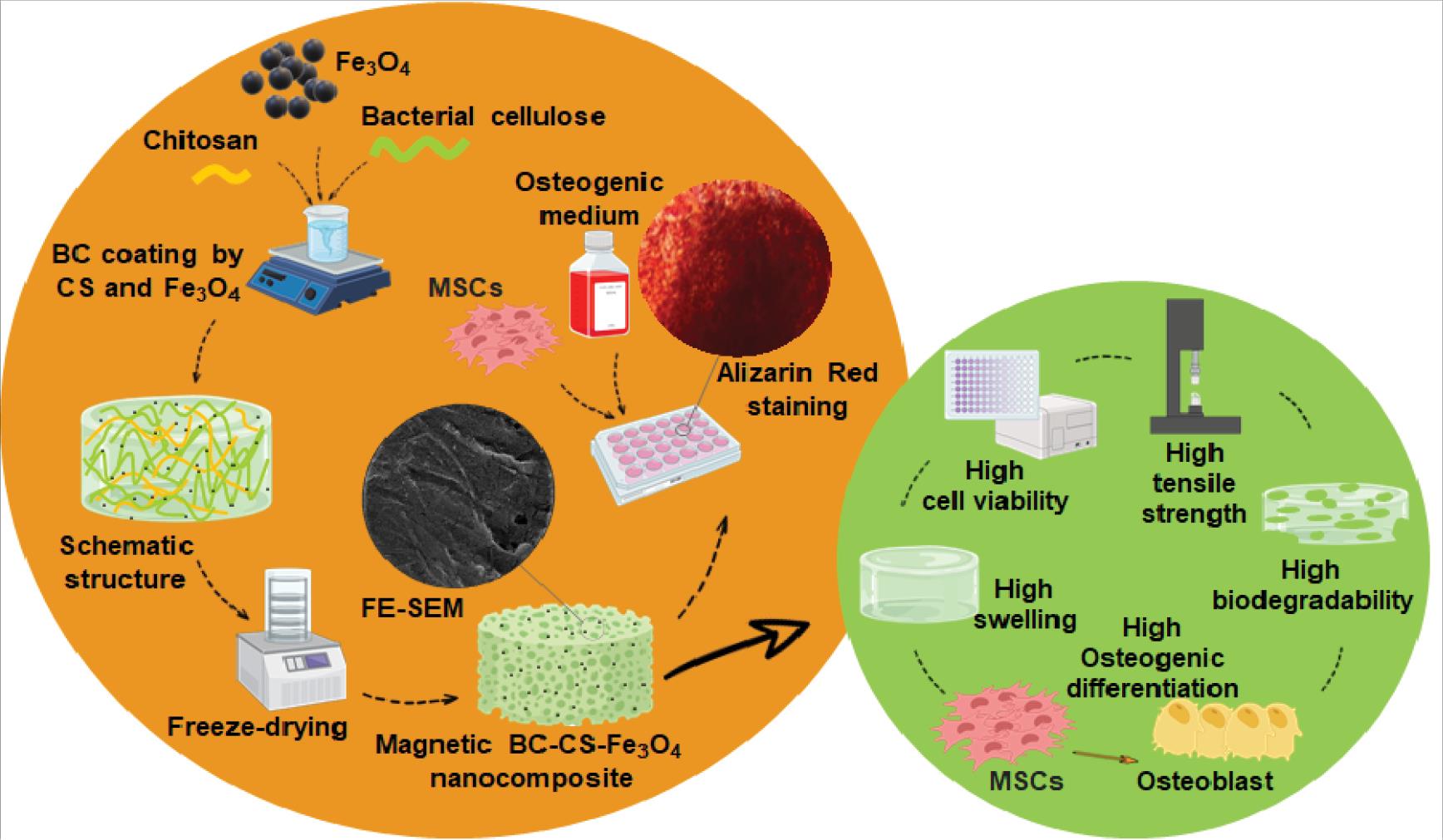 Keywords: Bacterial cellulose, Chitosan, Magnetic Fe3O4 nanoparticles, Biocompatible scaffold, Natural polymers, Osteogenic differentiation