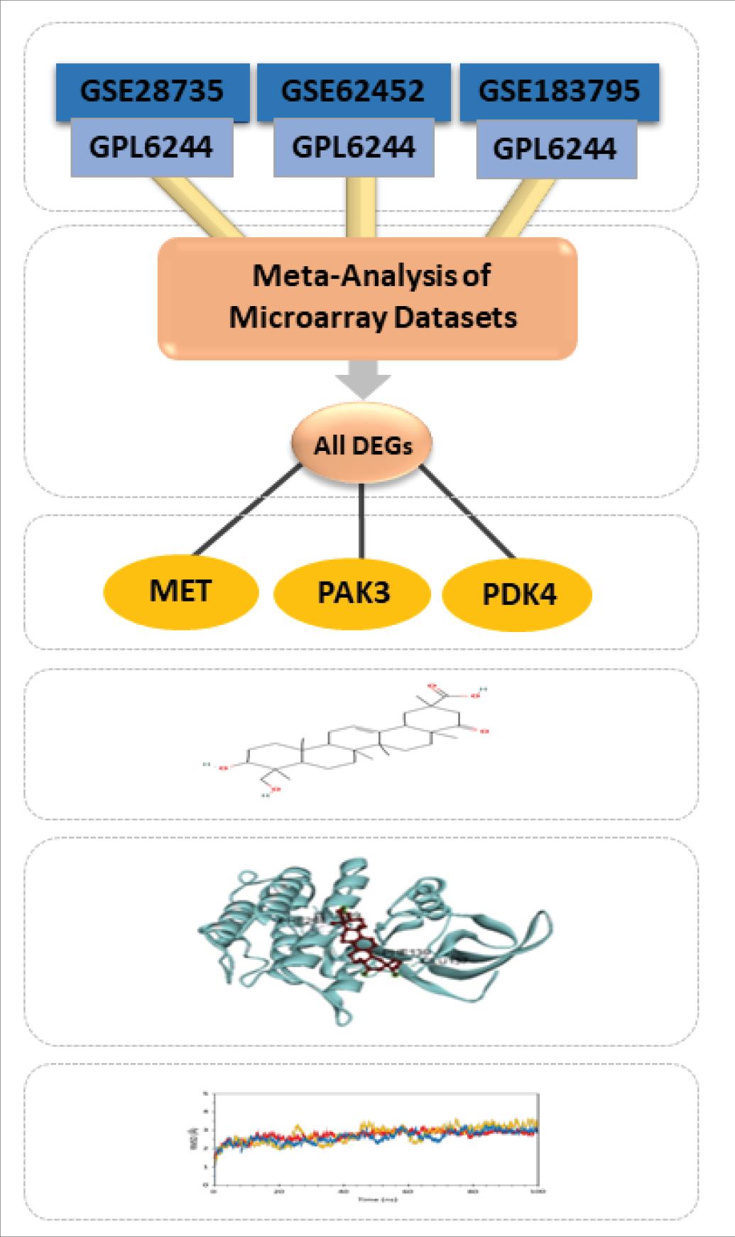 MET, PAK3, and PDK4 were identified as the DE-Kinases. After examining the pathways and biological processes, up-regulated MET had the most significant survival analysis and became our primary kinase for drug design and docking in this study. Four of the extracted phytocompounds of Melilotus officinalis (Linn.) Pall that exhibited high binding affinities with MET and were selected for toxicity analysis. Finally, the stability and mobility of the two nontoxic compounds that passed the toxicity test (dicumarol PubChem CID: 54676038 and melilotigenin PubChem CID: 14059499) were studied by molecular dynamics simulation.