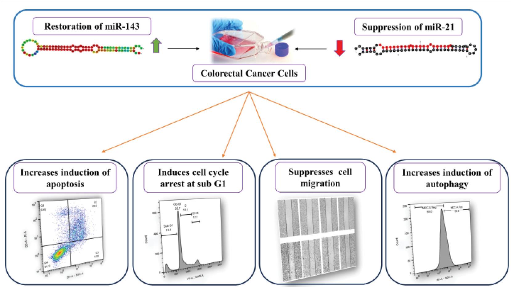 SW-480 cell lines (with overexpressed "miR-21" and downregulated "miR-143") were transfected via "anti-miR-21" and "miR-143" mimics, either independently or in combination. Next, cell viability assessment was performed through MTT assay. Then, apoptosis induction was examined with "Annexin V-FITC Kit", and via Propidium Iodide (PI) assay and DAPI staining. In the next step, "cell cycle condition" and "autophagy induction" were studied through flow cytometry. "Wound-healing assay" and "clonogenic assay" were employed to investigate the migration and proliferation of tumor cells. Ultimately, qRT-PCR was utilized to quantify the intensity of the effects of "anti-miR-21" and "miR-143" on gene expression profiles.
