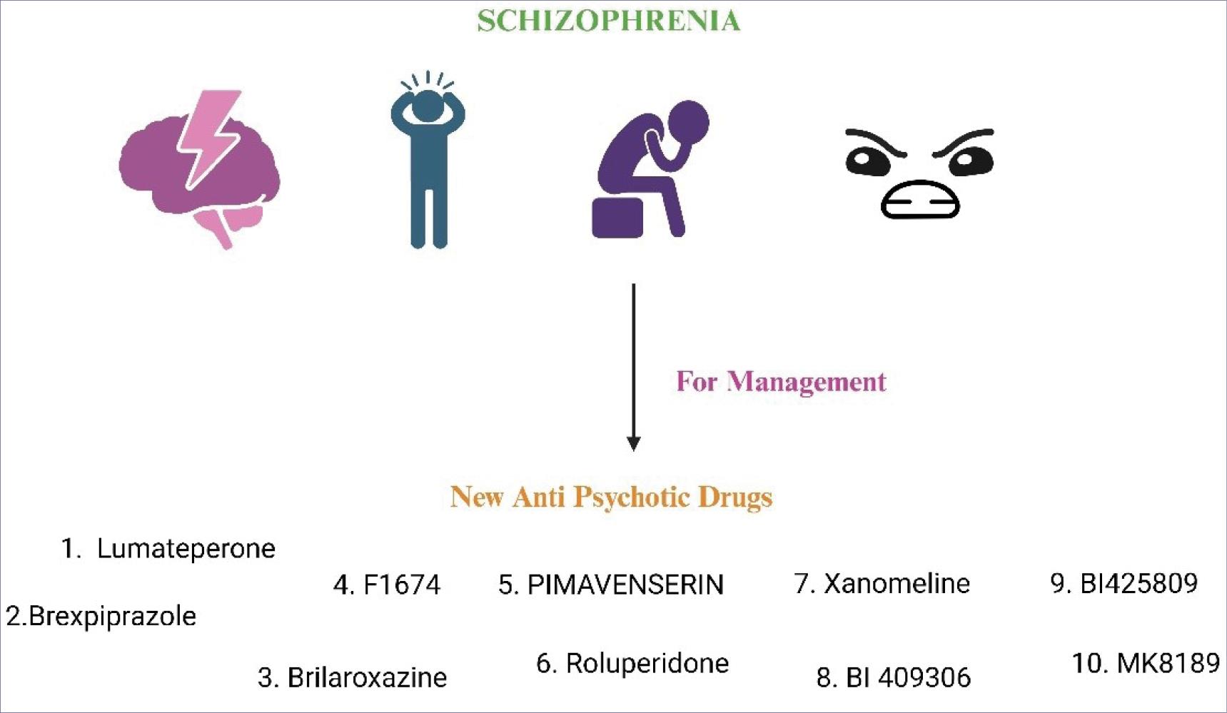 As previously mentioned, negative and cognitive symptoms can seriously affect a patient's ability to go about their daily lives. Developing therapies that reduce symptoms may enhance a patient's day-to-day functionality and overall quality of life. Targeting 5-HT2A serotonin receptors and creating medications better tailored to 5-HT2A receptors may significantly help better manage the symptoms.7-9 The dopamine hypothesis of schizophrenia states that dopaminergic neurotransmission disruption causes positive symptoms of schizophrenia.1 Individuals with schizophrenia may have lower amounts of extracellular dopamine than normal individuals at rest.10,11 In contrast, in the stimulated phasic state, they may have higher levels of intrasynaptic dopamine than normal individuals. Positive symptoms of schizophrenia may be linked to high intrasynaptic dopamine.10,11 While first- and SGAs reduce some symptoms with metabolic and neurological side effects as well as the inability to control both positive and negative symptoms.5,6 Due to the limitations and adverse effects of available antipsychotics, there is an urgent need for antipsychotics, so intense research and clinical trials are needed that can cure schizophrenia with minimal adverse effects. The prime focus of this article is understanding pharmacotherapy of lumateperone tosylate in detail and then focus on few emerging antipsychotic drugs like brexpiprazole, brilaroxazine, roluperidone, F17464, pimavanserin (ACP-103), xanomeline, BI 409306, BI 425809 and MK-8189 which are under different phase of clinical trials and their mechanism in depth. Antipsychotics discussed in this review can be approved soon and come into the market, which can help in the treatment and management of schizophrenia.