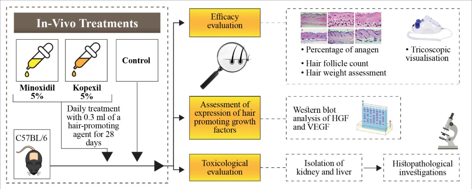 Given the gaps in research about the impact of kopexil on hair growth, membrane tissue, growth factors, histological effects, and its safety profile, along with the growing interest in this drug, our research team has decided to undertake a comprehensive series of in vivo studies on this medicine. These studies aim to explore the following aspects: