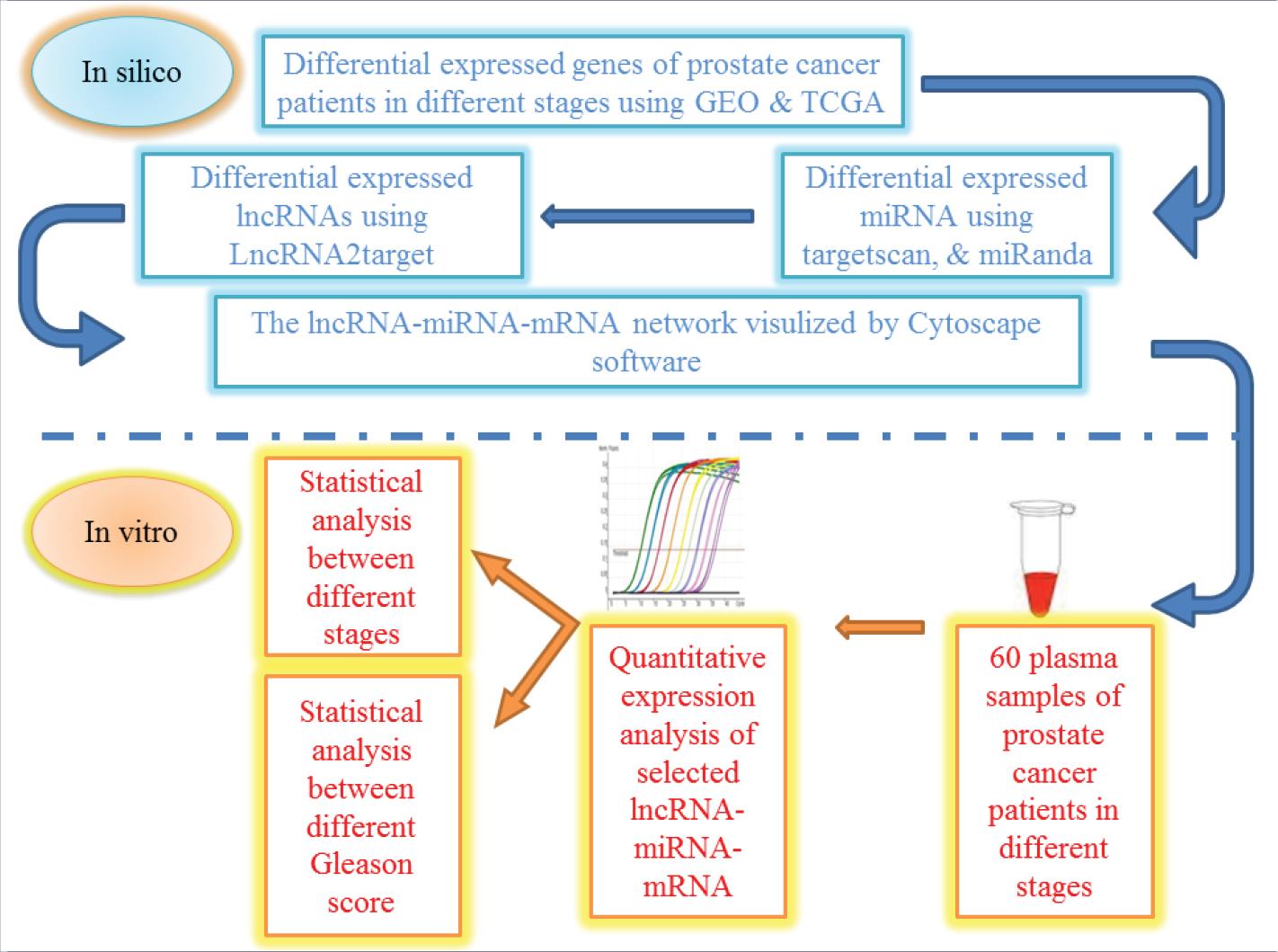 The mRNAs with significant expression differences were first analyzed using the GEO and TCGA databases. The lncRNAs and miRNAs were then identified in the miRWalk2, miRmap, OncomiR, miRGator 3.0, miRCancerDB, LncRNA2target, TANRIC, LncRNADisease, Lnc2Cancer v3.0, and LncBase. Seventy subjects, including sixty PC patients classified as local, locally advanced, biochemical relapse, metastatic, and benign groups, as well as ten normal individuals, were then included. Finally, real-time PCR determined the expression of the candidate biomarkers.