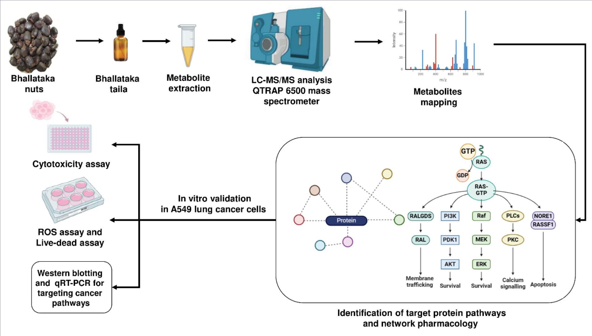 Bhallataka (Semecarpus anacardium Linn.) is used in traditional medicine to treat various ailments. The nut extract of Bhallataka, known as Bhallataka taila, has anticancer properties. Although several studies have explored to verify and evaluate its anticancer properties and efficacy against various cancers, the specific target proteins, mode of action, and associated metabolites have not yet been identified. This study aimed to elucidate the biological mechanisms of Bhallataka taila using an integrated metabolomics and systems pharmacology approach with in vitro validation.