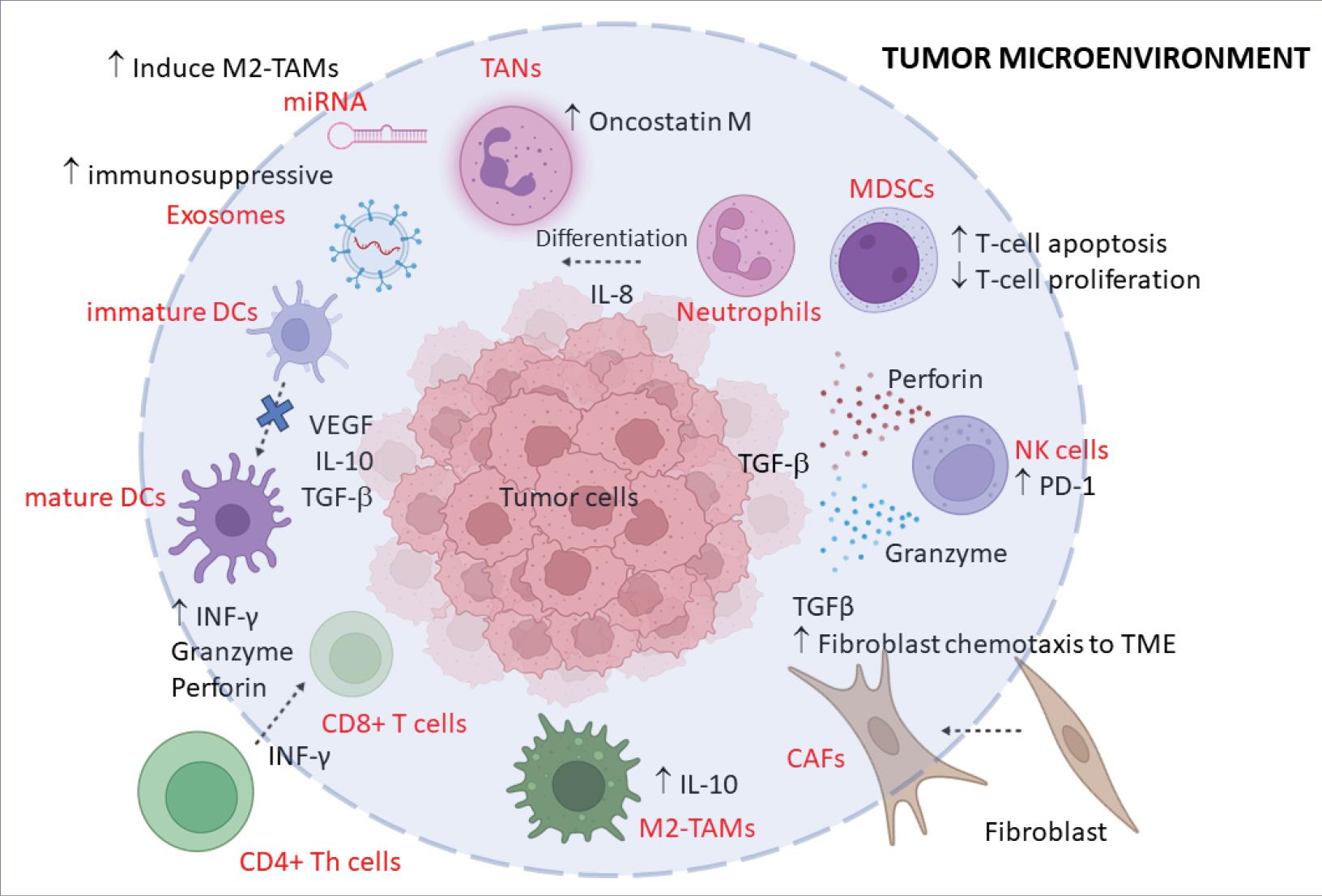 Cytokines are small proteins that play a vital role as a communication messenger in cell-cell communication and their effect on target cells depends on their substance, amount, and location. Certain cytokines secreted by cells in the TME play a role in organizing the surrounding region to provide better support for malignant cells. For instance, TNF-𝛼, prostaglandin E2 (PGE2), TGF-𝛽, Interferon-γ (IFN-γ), and IL-10 are involved not only in TME construction but also in the formation and progression of the malignancy.92-94