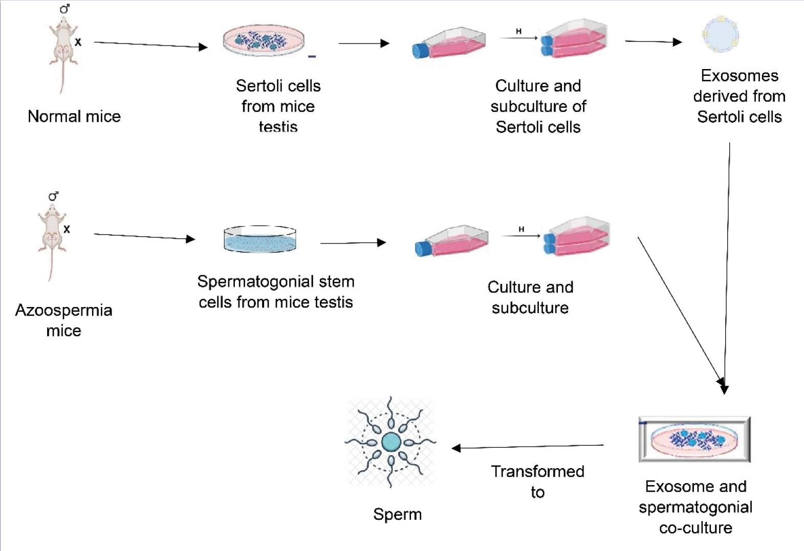 In this study, we investigated the effect of exosomes isolated from Sertoli cells on spermatogonia stem cells. According to the comparison between our research findings and those of our previous works, SC-extracted exosomes can act as an inducer, advancing the stages of spermatogenesis in SSCs up to the sperm stage by expressing the VASA, SYCP3, HAPRIN, and DAZL genes. Additionally, microscopic observations revealed a clear morphological change in SSCs from a fibroblastic form to a sperm-like one. It has been concluded that the inducing property of SCs is solely due to factors present in the soluble exosome, as there is no direct contact between SCs and SSCs. Therefore, further studies should be conducted to identify the existing factors of SC exosomes and understand the differentiation induction mechanisms in SSCs. This could prepare the ground for the use of azoospermia in controlling and treating male infertility patients in the future. Briefly, SSCs are among the most suitable cell sources for the production of sperm in azoospermic individuals.