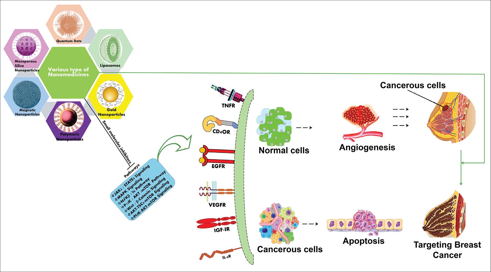 Breast cancer (BC) is a complicated disorder having diverse subtypes exhibiting variable responses to the treatment. It stands second after lung cancer. In 2020, over 2 million new cases including around sixty-five fatalities have been mentioned in literature and it is projected that there will be over 3 million new cases of breast carcinoma and one million fatalities in 2040.1 BC is a proliferative form of cancer that initiates from breast tissues which is strongly influenced by both hereditary and environmental variables.2 Amounts of oestrogen and androgen are accountable for the development of BC.3 Additionally, it is well known that genetic variations in the genes for BRCA1, BRCA2, TP53, RB, PIK3, MDM2, HER2, and TPK53, CDH1, PTEN, STK11, ATM, BRIP1, PALB2, CHEK2, and NBS1 are strongly linked to BC.2,4,5 It is susceptible to numerous other factors also, including a family history of the disease, obesity, a high-calorie diet, not breastfeeding, using oral contraceptives, and ingesting hormones like oestrogen in hormone replacement therapy.6 Depending on specific molecular markers such as the proliferation marker Ki67, human epidermal growth factor receptor 2 (HER2), the oestrogen receptor (ER), and progesterone receptor (PR), BC is categorised as luminal A-like, luminal B-like, HER2 enriched, and triple-negative BC (TNBC).2,7 Luminal A-like subtype shows improved diagnosis than other subtypes.8 Luminal B-like (HER2-) tumours are ER and/or PR positive, HER2 negative, and high Ki67 index or low expression of PR. Luminal B-like (HER2+) tumours are ER-positive while HER2 are positive including any PR level and any Ki67 level. HER2-positive, ER and PR-negative tumours are referred to as HER2-enriched tumours.9 ER, PR, and HER2 are all negative in the basal-like triple-negative subtype of BC.10 The diagnosis of TNBC patients is frequently poorer than people affected with other kinds of BC due to the absence of established therapeutic molecular targets. In addition, younger women are frequently affected by the TNBC.11 Cancer treatment involves the use of radiation, chemotherapy, hormonal therapy, and removal of cancer through surgery. These treatments are not specific as they may kill normal cells or incomplete removal of tumour occurs which causes toxicity. Traditional therapies often lack specificity, leading to systemic toxicity and reduced efficacy. Now, anthracyclines (doxorubicin, epirubicin), taxanes (paclitaxel [PTX], docetaxel), platinum drugs (cisplatin, carboplatin), cyclophosphamide are frequently employed in BC chemotherapeutic treatment.12 Hormonal treatment aims to inhibit the action of oestrogen or reduce oestrogen levels, which may promote the development of BC cells. The primary medications used in endocrine therapy are aromatase inhibition drugs (Ais: letrozole, anastrazole, and exemestane), in addition to selective oestrogen receptor modulators (SERMs: tamoxifen and toremifene) and selective oestrogen receptor degraders (SERDs: Fulvestrant).13 Currently, tyrosine kinase inhibitors (neratinib, lapatinib, etc.), anti-HER2 monoclonal antibodies (trastuzumab & pertuzumab), and antibody-drug conjugates (trastuzumab-emtansine, or T-DM1) are the primary medications used in HER2 selective treatment.14