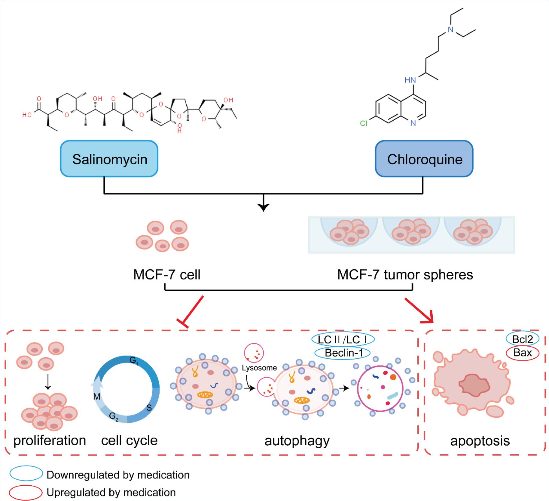 In conclusion, salinomycin activated autophagy and promoted apoptosis by down-regulating the PI3K/AKT/mTOR pathway, and the combination of chloroquine and salinomycin reduced the tumor spheroid number and volume of MCF-7-TS cells and cell colon, and increased apoptosis and cell cycle arrest by inhibiting the salinomycin-induced autophagy to enhanced the anticancer effect of salinomycin. This finding presents a promising avenue for BC treatment, offers new insights into potential therapeutic strategies, and supports the notion that excessive autophagy enhances resistance to BC, potentially serving as a key mechanism underlying the poor efficacy of clinical chemotherapy agents.