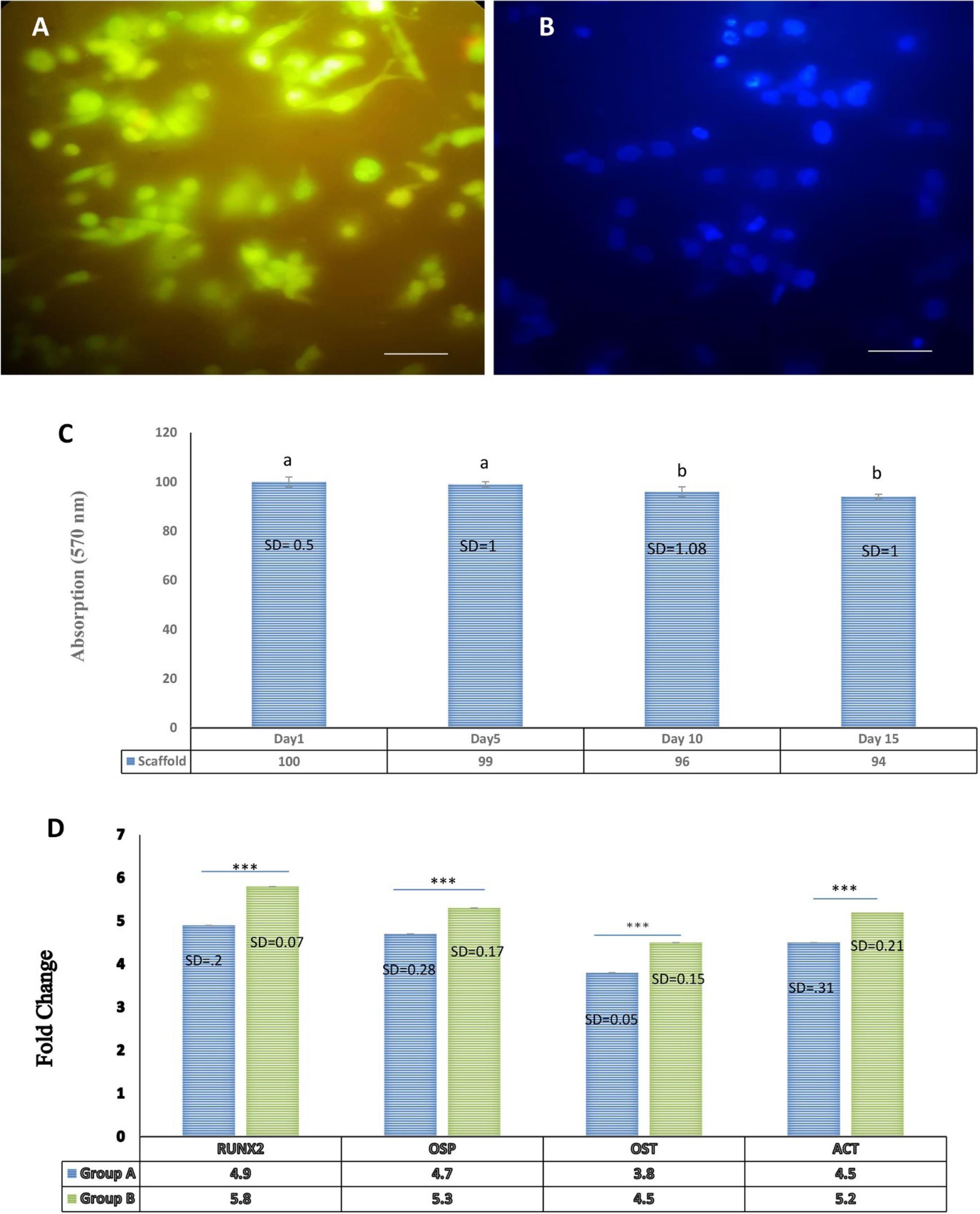 Evaluation of cell viability and quantitative gene expression analysis using qRT-PCR. (A) Acridine orange/ethidium bromide (AO/EB) staining to assess the viability of EnMSCs cultured on the nanocomposite scaffold after 48 h. (B) DAPI staining to observe morphological changes in cellularnuclei. (C) MTT assay for the effect of concentrations of 50 µg/mL of GQDs on EnMSC survival cultured on PAN/MOF-Cu at days 1, 5, 10, and 15. (Non-consecutive letters show a significant difference at the confidence level of P < 0.05). (D) Investigation of osteogenic gene expression in differentiated cells treated with GQDs compared to the control (standard osteogenic culture media alone) 21 days post-treatment, using the RT-PCR method. The expression levels of Osteopontin, Osteocalcin, Col 1, and RUNX2 genes in group B showed a significant increase compared to group A. Each test was repeated three times, and normalization was performed using the ACTB gene.*** P < 0.001; ** P < 0.01; * P < 0.05. The scale bar represents 100 µm.