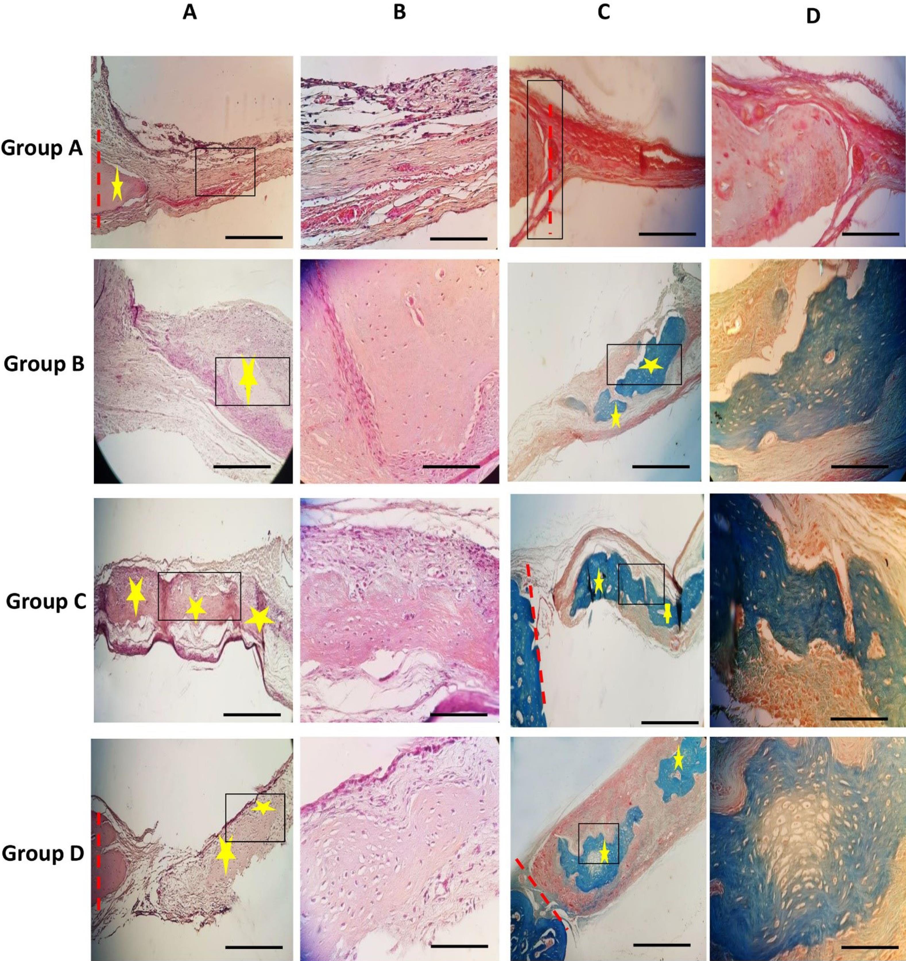 Histomorphological experiments were conducted after 10 weeks across all groups. In the control group (group A), loose fibrous tissue covered the defect area, with no new bone formation observed. In the cell-free scaffold group (group B), after 10 weeks, no scaffold material remained. Despite the presence of fibrous tissue, new bone formation was observed around the center of the defect, with an estimated new bone formation percentage of around 11%, indicating significant tissue generation compared to the control group. In the scaffold with undifferentiated cells/GQDs group (group C), a significant amount of new bone tissue was observed after 10 weeks, growing from the margins toward the center of the defect area. This new bone tissue contained numerous lacunae with osteocytes, and several blood vessels were scattered throughout the defect area. At this stage, loose fibrous tissue was significantly reduced. With new bone formation measured at approximately 39%, this group exhibited the highest level of new bone formation, followed by groups D and B, both of which exceeded the control group.
