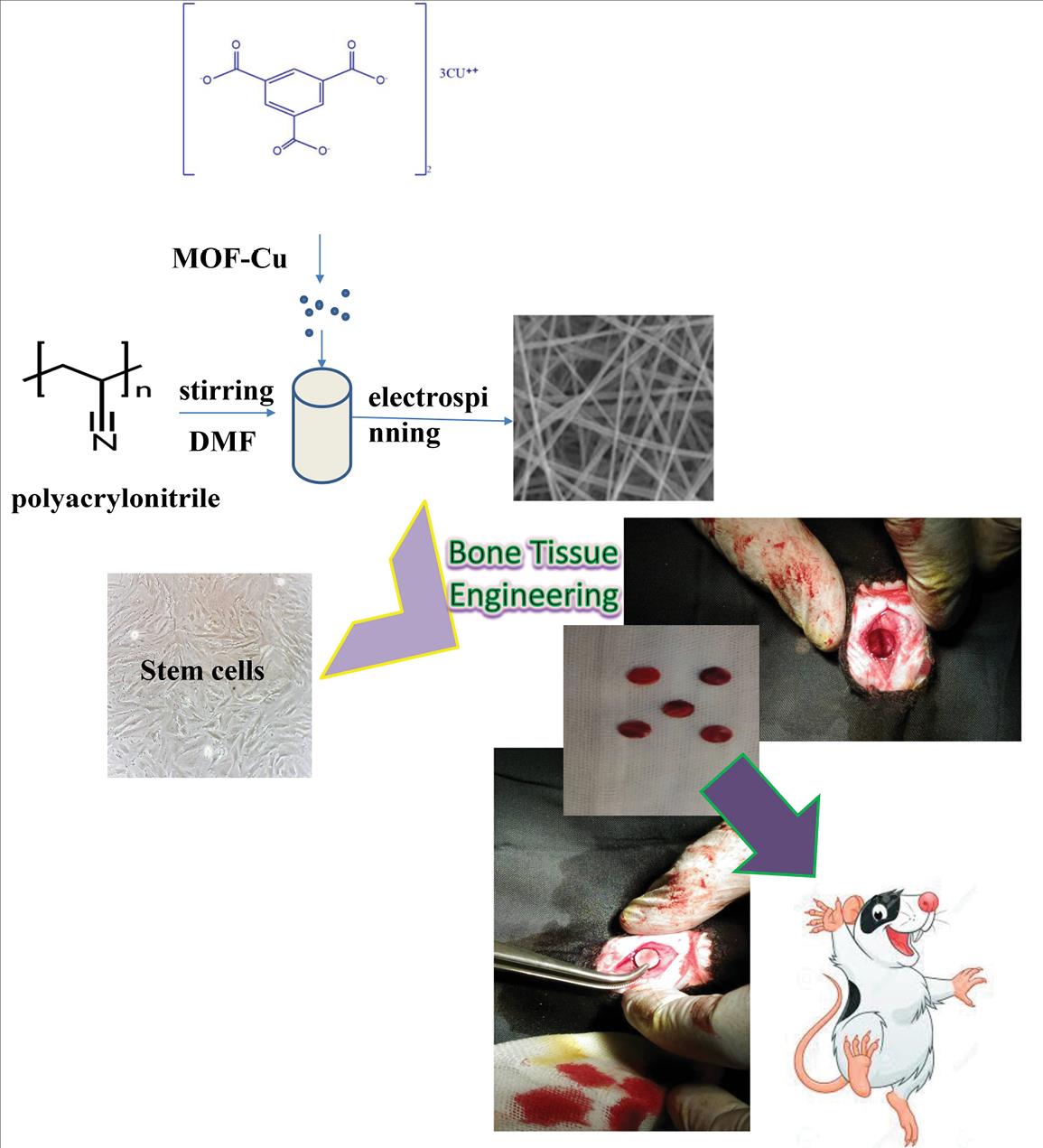 The findings from this study provide strong evidence that EnMSCs can effectively attach and proliferate on the PAN/MOF-Cu nanocomposite. Furthermore, our research shows that including GQDs significantly enhances the recovery process. Our innovative hybrid protocol demonstrated remarkable efficacy in repairing critical-sized bone defects. Notably, PAN/MOF-Cu exhibited excellent osteoconductive properties without adversely affecting EnMSCs or in vivo conditions. Therefore, we confidently conclude that combining human EnMSCs/GQDs and PAN/MOF-Cu holds substantial promise for applications in bone regenerative medicine.