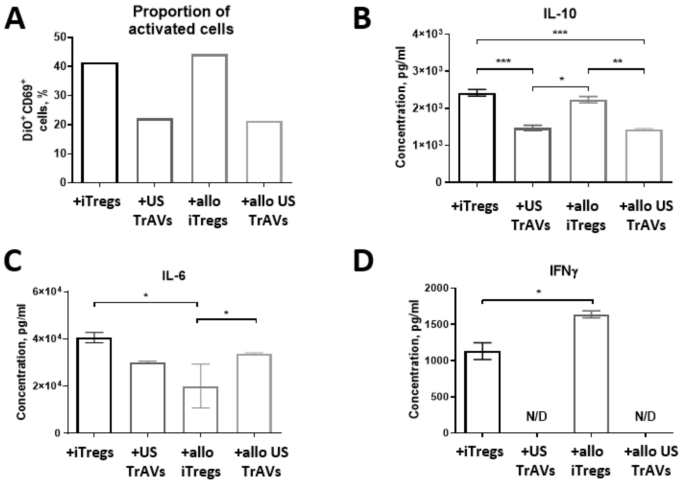 Impact of iTregs, B2M-knockdowned iTregs (allo iTregs), and ultrasonication-induced artificial vesicles (US TrAVs and allo US TrAVs) on the activation of allogeneic PBMCs from a healthy donor.(A) Flow cytometry analysis of CD69 + activated PBMCs. Co-cultivation with iTregs, allo iTregs, US TrAVs, and allo US TrAVs resulted in varying levels of PBMC activation, with US TrAVs and allo US TrAVs showing the most significant suppression of CD69 + expression. (B) IL-10 concentrations in supernatants, as measured by ELISA. US TrAVs significantly reduced IL-10 secretion compared to iTregs, while allo iTregs and allo US TrAVs exhibited intermediate effects. (C) IL-6 concentrations in supernatants. IL-6 levels were modulated differently by the treatments, with a significant reduction observed in certain groups. (D) IFNγ concentrations in supernatants. IFNγ was detected in co-cultures with allo iTregs, whereas no detectable levels (N/D) were observed with US TrAVs or allo US TrAVs. PBMCs were activated with 5 μg/mL PHA. DiO staining was used to distinguish PBMCs from iTregs during flow cytometry. Error bars represent standard deviations, and statistical significance is denoted as *P < 0.05, ** P < 0.01, *** P < 0.001.