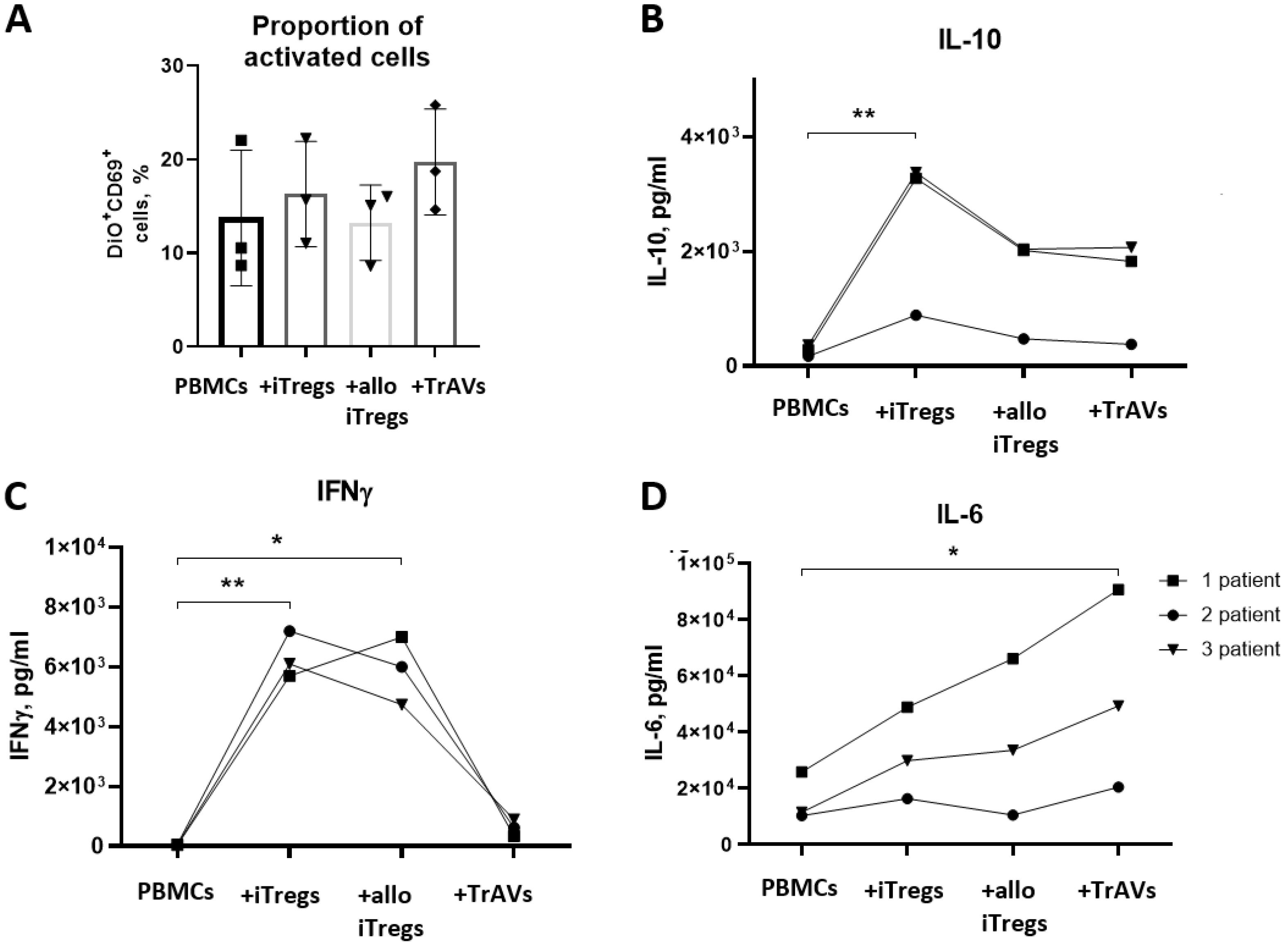 The concentration of IL-6 increased with co-cultivation of patients’ PBMCs with iTregs, allo iTregs and allo TrAVs, while the degree of effect was different for each patient, and the maximum increase in IL-6 concentration was observed with co-cultivation of patient PBMCs with allo TrAVs (Fig. 8C).