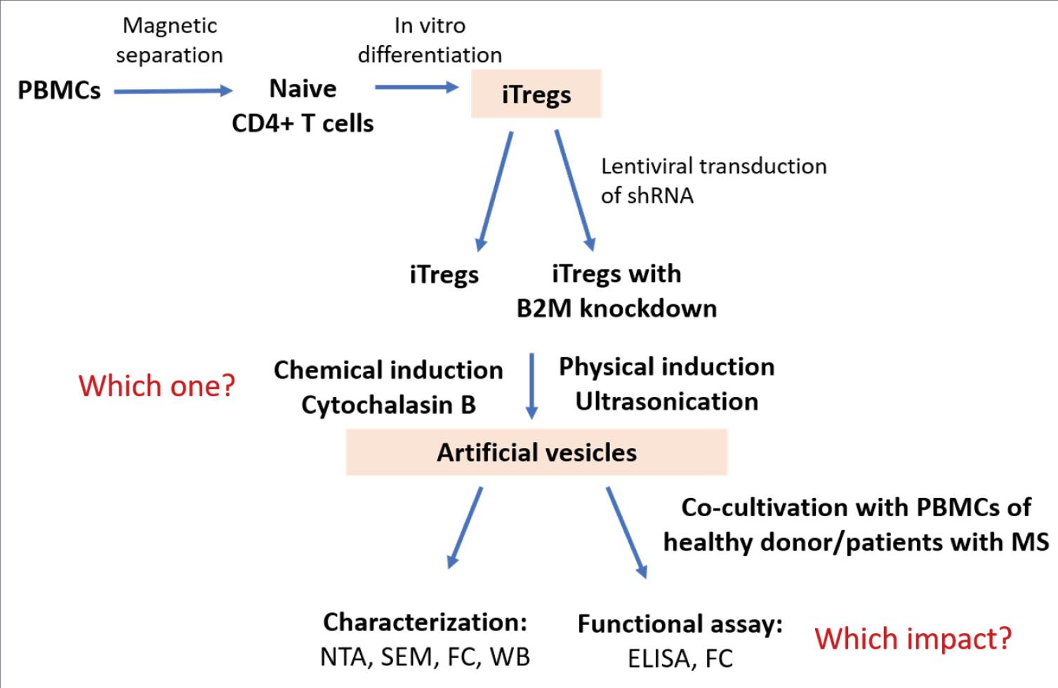 In this study, we present a novel strategy for developing artificial vesicles (AVs) derived from in vitro differentiated Tregs. The approach integrates three key components: (1) differentiation of naive CD4+ T cells from healthy donors into functional iTregs, (2) knockdown of β2-microglobulin (B2M) to reduce immunogenicity and improve allogeneic compatibility, and (3) induction of AVs using chemical and physical methods. The generated AVs were thoroughly characterized for their structural, molecular, and functional properties and assessed for their potential to modulate immune responses in vitro using peripheral blood mononuclear cells (PBMCs) from both healthy donors and MS patients. Important criteria for evaluating such AVs are parameters such as the efficiency of B2M knockdown, which is important for reducing immunogenicity. Also important is the transfer of key suppressor molecules by these vesicles, such as LAG-3, Tim-3, CTLA-4, and PD-1, since these are the main molecules through which Tregs exert a suppressor effect on other immune cells. In addition, it is necessary to confirm the non-apoptotic nature of the vesicles, since apoptotic bodies have a size similar to some vesicle fractions and can be immunogenic.