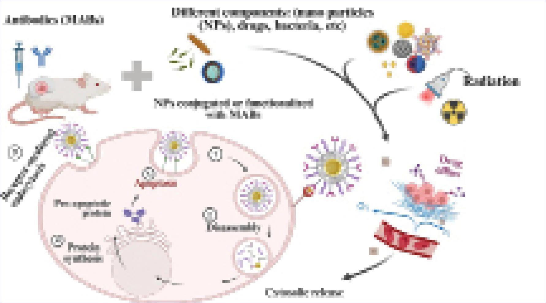 Monoclonal antibodies are laboratory-engineered molecules designed to bind to specific antigens found on the surface of cancer cells.22 By recognizing and binding to these targets, mAbs can directly interfere with cancer cell growth and survival.23 Additionally, monoclonal antibodies can be combined with other therapeutic agents, such as chemotherapy, nanoparticles, and bacteria, to enhance their effects.24 This combination approach enables more effective treatment strategies and reduces the adverse side effects associated with traditional therapies.25 Furthermore, monoclonal antibodies can sensitize cancer cells to radiotherapy, known as radiosensitization.26